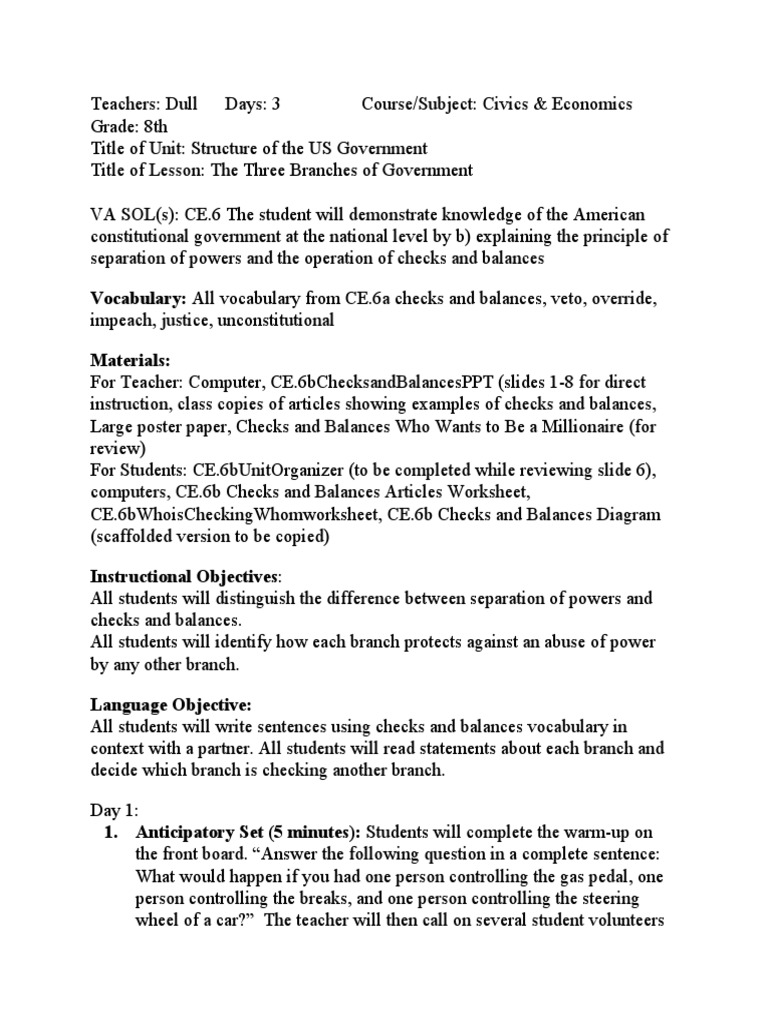 Lesson Plan Us Government The Checks And Balances System Of The
