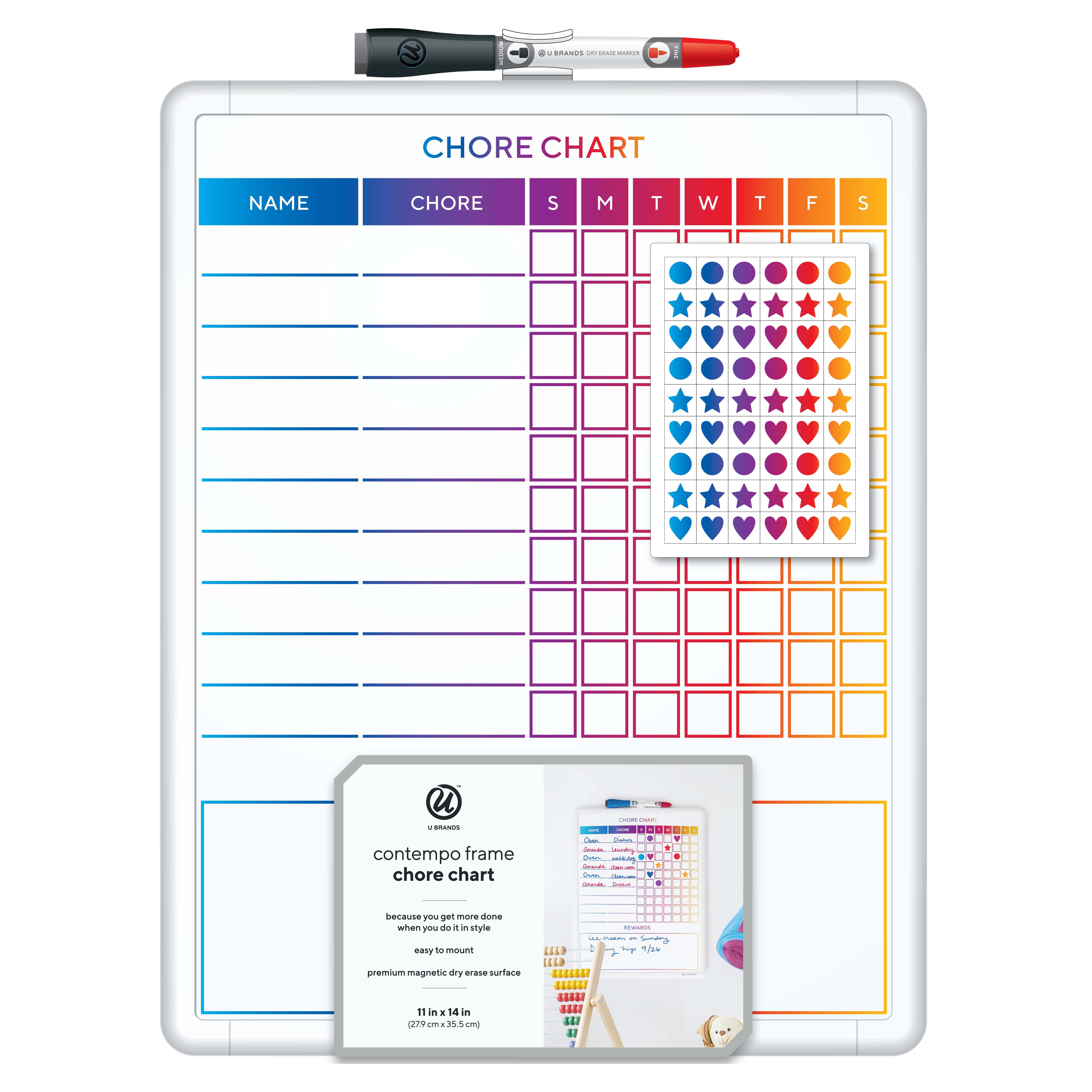 The most popular color. Magnetic dry erase chore chart for multiple kids and adults. This easy to read 11 x 14 inch chore chart provides columns for the days of the week and rows for the various chores around the house.